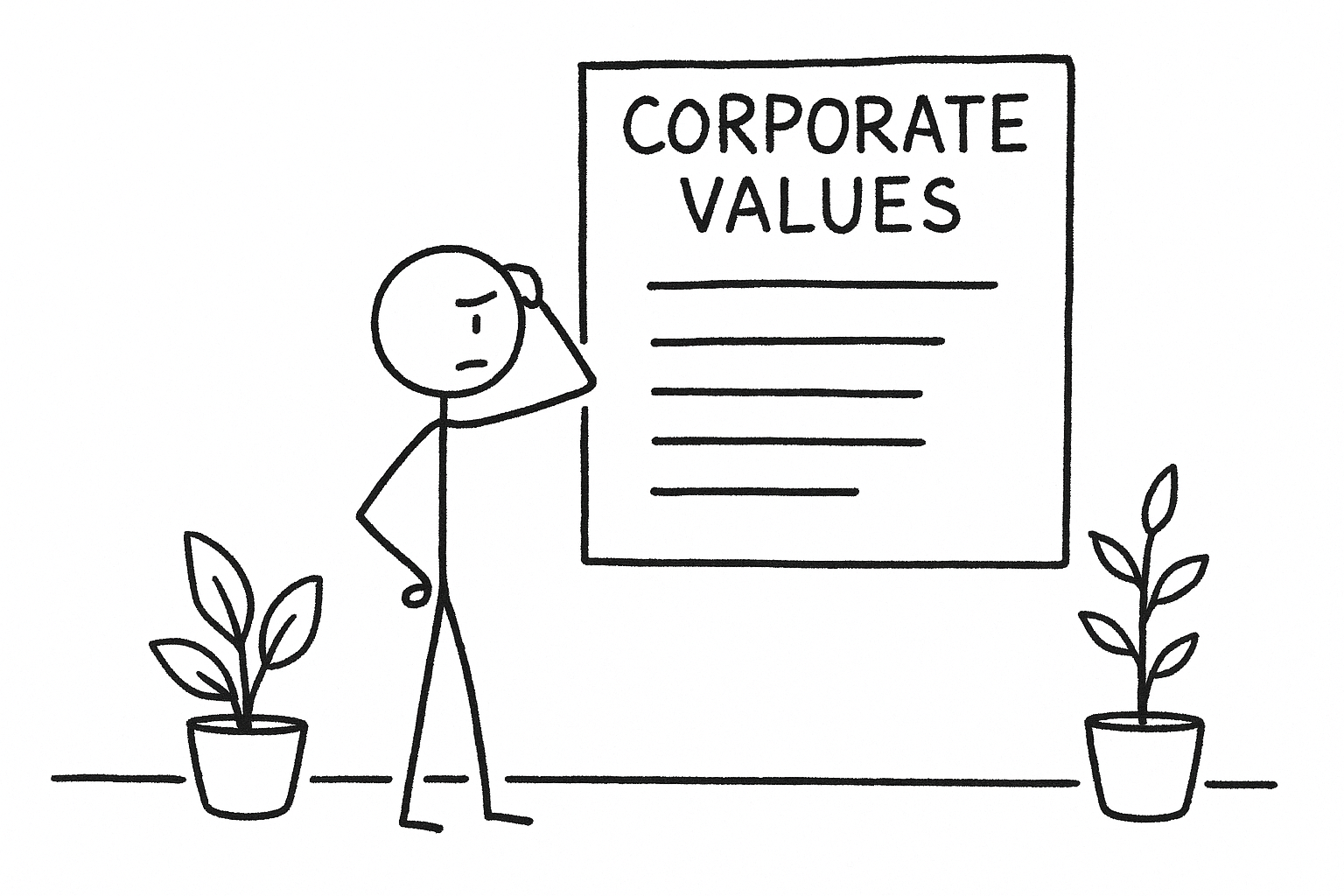 Recently, I watched a team leader freeze mid-sentence during an all-hands meeting. Someone had asked what "innovation" actually meant at our company. After a long pause, he pointed to the values poster behind him and jokingly said, "Well, it's right there." The room went quiet. Not the good kind of quiet.