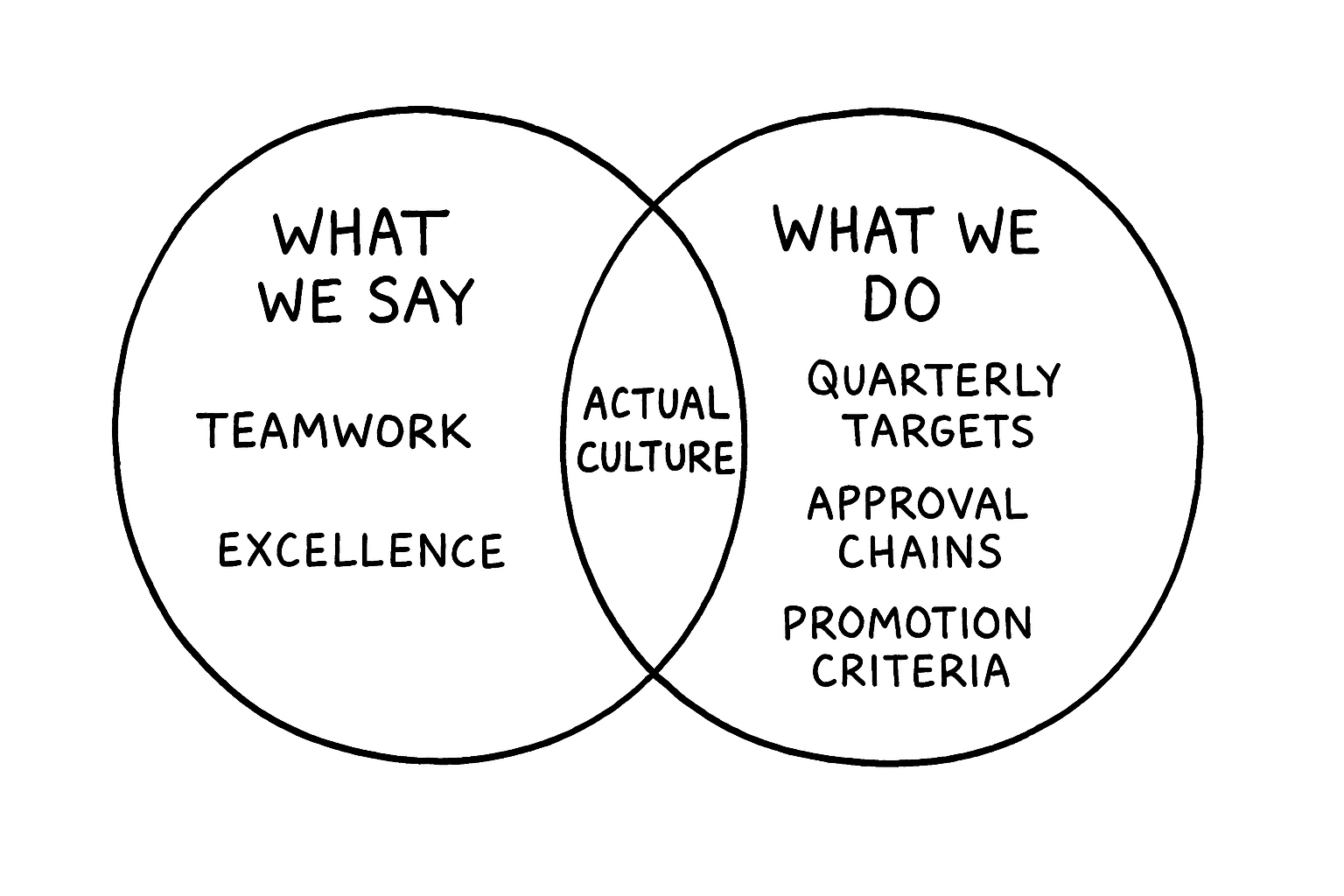 That moment stuck with me because it's so painfully common. We plaster values on walls, weave them into slide decks, mention them in onboarding. Then we wonder why they don't show up in how people actually work. The truth is, culture lives in the tiny decisions made when no one's watching. It's in how a manager responds to a mistake, which projects get greenlit, who gets promoted and why.