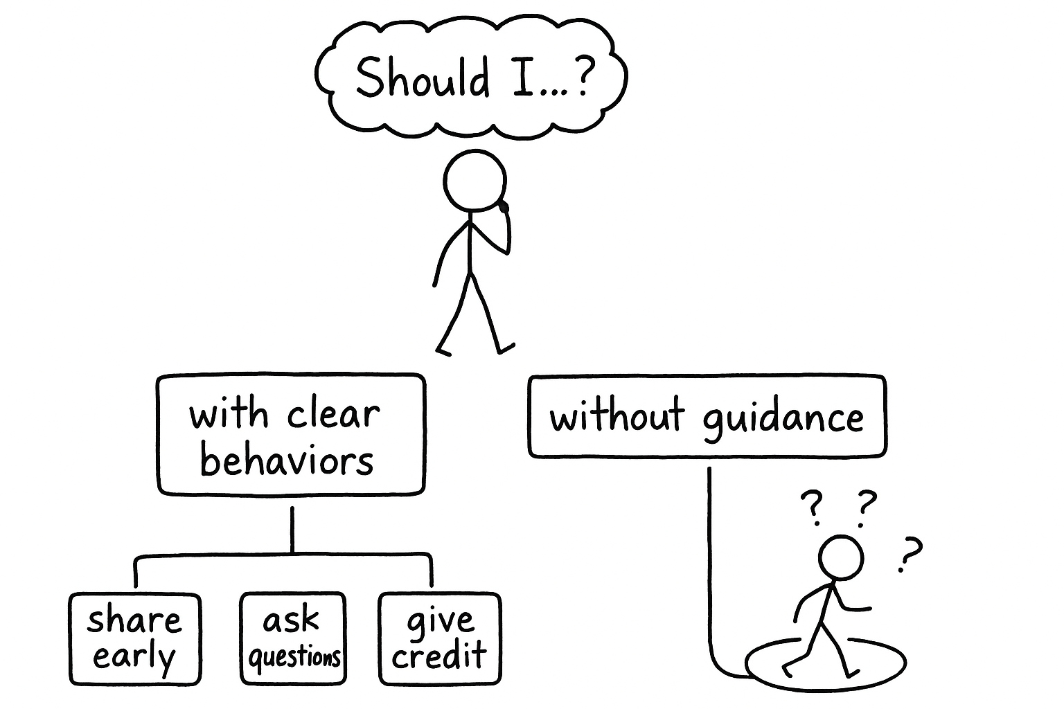 So we got specific. We created simple guides showing what each value looked like in common situations. Not rigid scripts, but clear examples. For "collaboration," we outlined what it meant to share credit, how to disagree productively, when to loop others in. We also called out what it didn't mean, because sometimes the don'ts are just as clarifying as the dos.